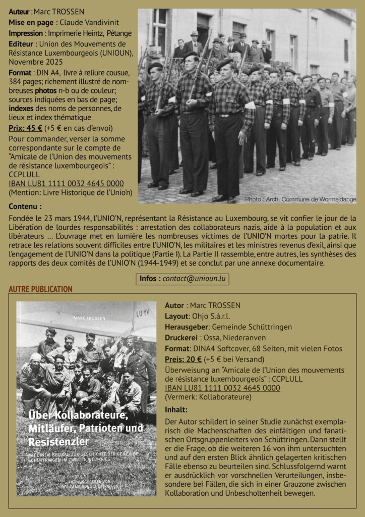 Zwou fuschnei Publikatioune sinn elo disponibel ! Beitrag veröffentlicht:12/11/2025 Das könnte dir auch gefallen Amicale de l’Union des mouvements de resistance luxembourgeois 23/10/2025 D’UNIOUN hëlleft der Ukrain 27/04/2022 Entrevue mam Här Premierminister Xavier Bettel 17/06/2023